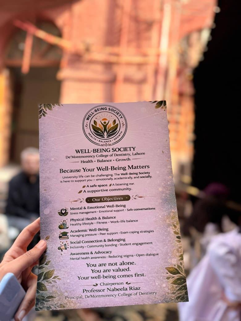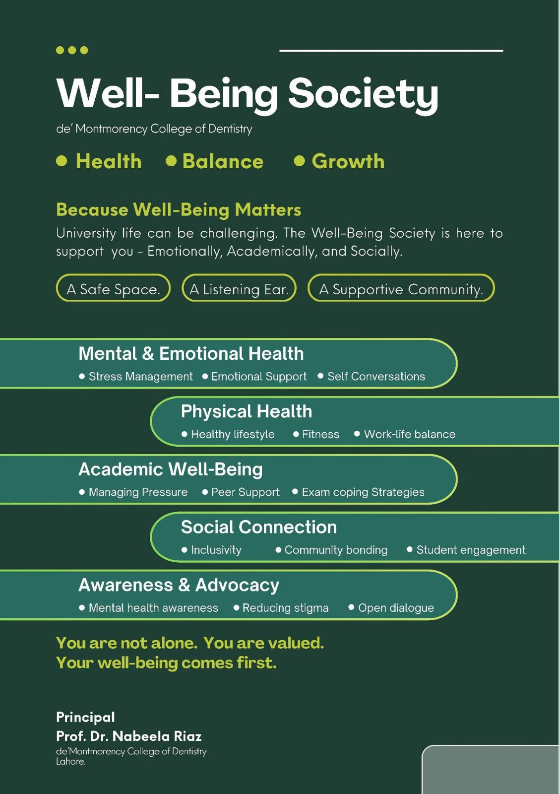 The Well-Being Society was officially inaugurated on 2nd March 2026. The society is co-chaired by Prof. Dr. Zainab Rizvi and functions under the leadership of Prof. Dr. Nabeela Riaz Mirza.